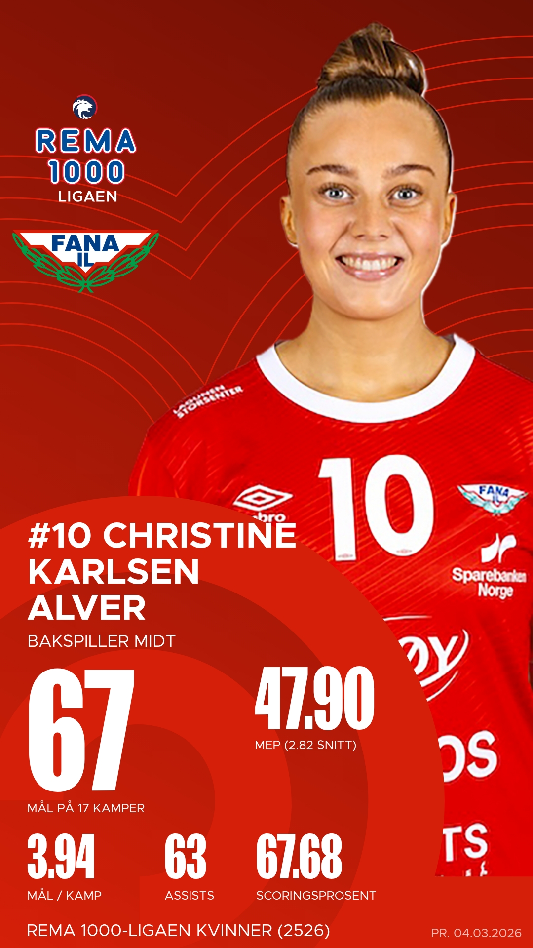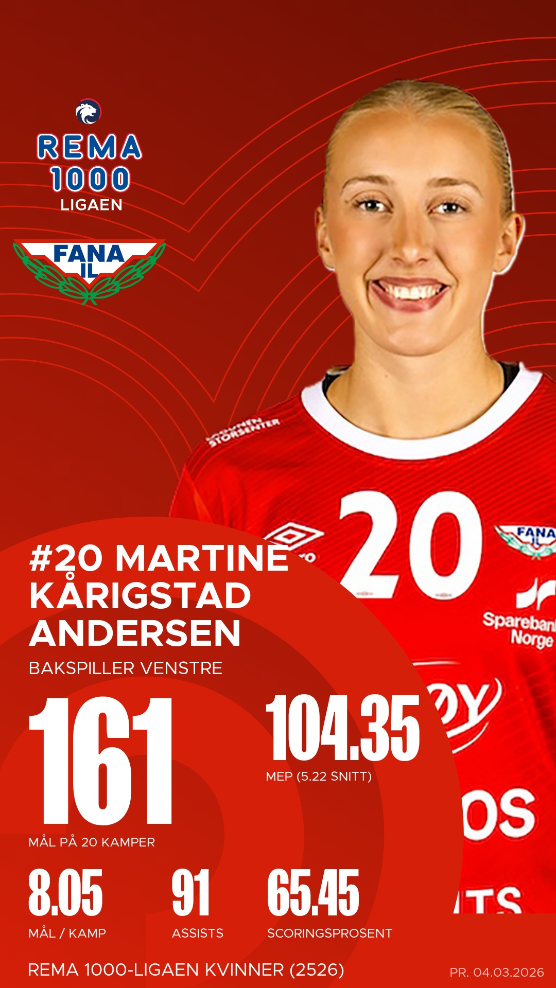 Fana stiller med flere profiler i toppform. Martine Kårigstad Andersen har vært en motor i laget gjennom hele sesongen – en bakspiller med både kraft og presisjon, og med et imponerende antall mål og assists. Christine Karlsen Alver styrer angrepsspillet med kløkt og tempo, og hennes samarbeid med Eline Osland på høyresiden har gitt mange gjennombrudd og lekre scoringer. Osland har vært blant lagets mest kreative spillere, med både målfarlighet og evne til å sette medspillere i gode posisjoner.